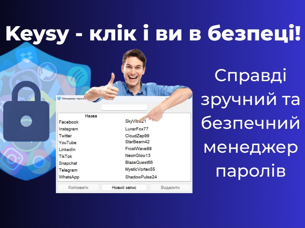 Keysy – зручний менеджер паролів, що допомагає безпечно зберігати паролі. Багато людей тримають їх у незахищених місцях: текстових файлах на робочому столі чи нотатках, ризикуючи втратити доступ до email, соцмереж чи банків. Причини – складні інтерфейси менеджерів паролів та брак знань кібербезпеки. Keysy має простий інтерфейс, мінімум кнопок і вбудований генератор паролів. Кілька кліків – і ваші паролі в надійному зашифрованому сховищі без зайвих зусиль. Спробуйте Keysy сьогодні!
